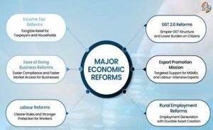 India’s 2025 Economic Reforms focus on simplifying systems, reducing compliance burdens, and enhancing predictability. The reforms emphasize ease of living, ease of doing business, and inclusive growth. Key sectors such as taxation, GST, labour regulation, and business compliance are being restructured to ensure smoother, faster, and more transparent economic interactions. These reforms are aligned with India’s long-term growth and Aatmanirbhar Bharat vision, improving trust in institutions and policy certainty.