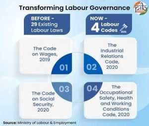- In a landmark reform, the Government of India consolidated 29 existing labour laws into four Labour Codes- the Code on Wages, 2019, the Industrial Relations Code, 2020, the Code on Social Security, 2020 and the Occupational Safety, Health and Working Conditions Code, 2020.The new framework enhances ease of doing business while expanding wage security, social protection, and workplace safety for workers, including women, migrant, gig, and platform workers.