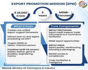 - In a major boost to India’s trade competitiveness, the Union Cabinet approved the Export Promotion Mission (EPM) as a flagship structural reform with an outlay of Rs. 25,060 crore for FY 2025–26 to FY 2030–31. Announced in the Union Budget 2025–26, EPM marks a strategic shift from fragmented export support schemes to a single, outcome-based and digitally driven framework, aimed at empowering MSMEs, first-time exporters, and labour-intensive sectors. The Mission integrates financial support (Niryat Protsahan) including affordable trade finance and credit enhancement with non-financial enablers (Niryat Disha) such as quality compliance, branding, logistics, and market access.
