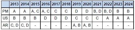 Note that in 2016, the rank of C lies between B and E, so