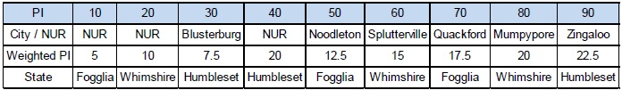 all cities and all NURs) where the PI of the NUR is greater