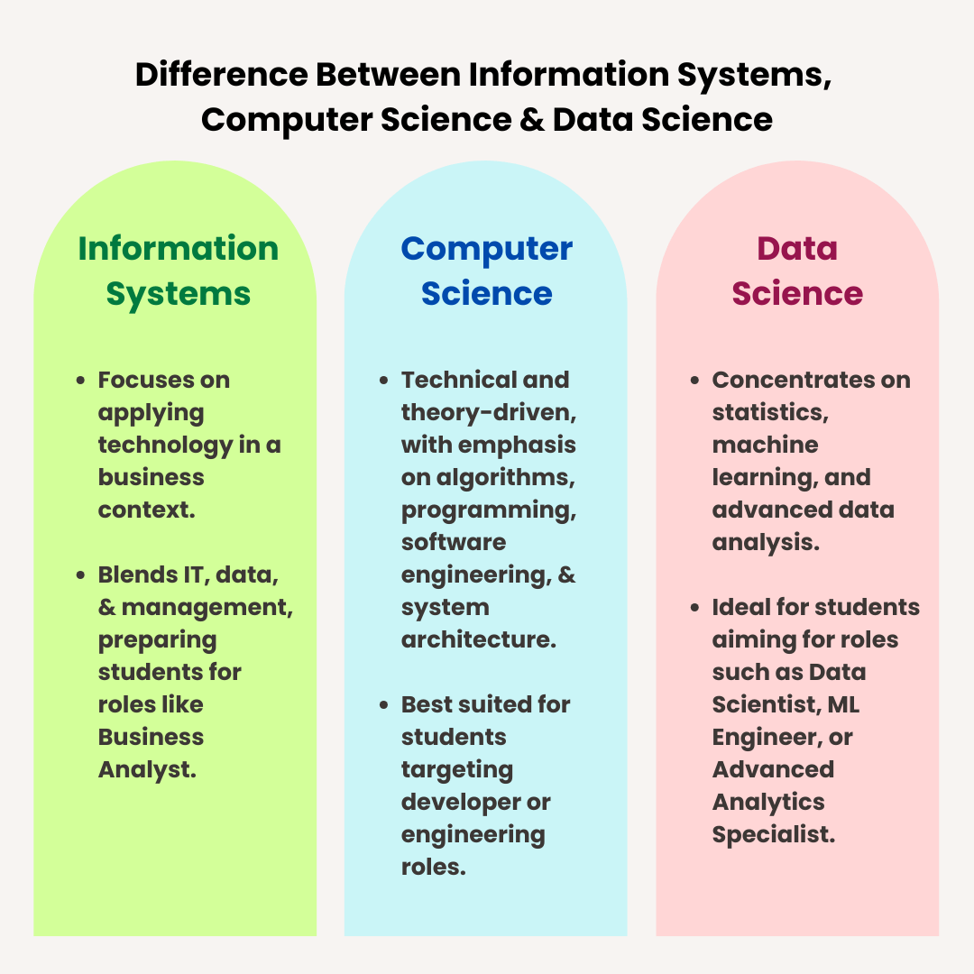 In short, an MS in Information Systems is best for students who want both technical knowledge and business impact, rather than deep coding or pure statistical modelling.